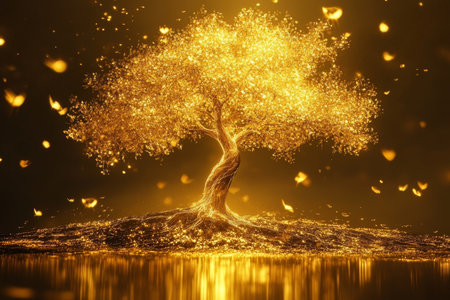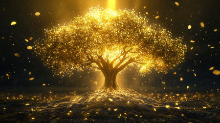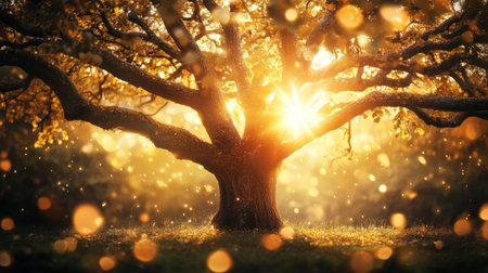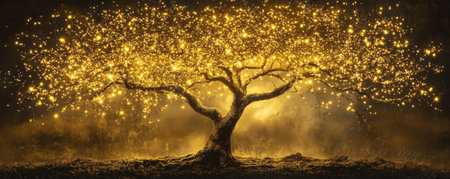A luminous and enchanting tree radiates a warm golden light in a mystical atmosphere filled with sparkling enchantment