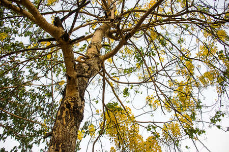 ( Cassia fistula, golden shower tree ) yellow flower blooming on roadside in april around the old wall , Chiang Mai, Thailand