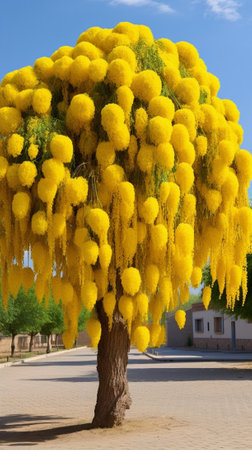 A stunning scene featuring a tree adorned with vibrant yellow flowers, illuminated by warm sunlight, creating a tranquil and cheerful garden ambiance.