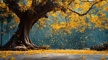A stunning scene of a yellow flowering tree amid rain, with petals cascading down, reflecting the beauty and tranquility of nature.