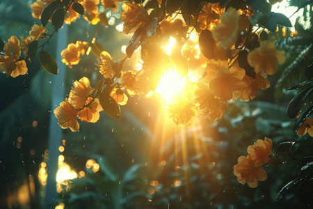 A stunning capture of vibrant yellow flowers illuminated by sunlight filtering through a green forest. This serene scene showcases nature's beauty and tranquility.