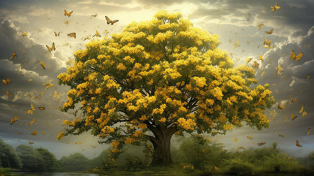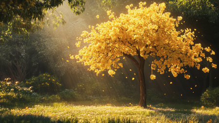 A majestic tree adorned with golden blossoms stands in sunlight rays, creating a serene and picturesque scene in a tranquil nature setting.