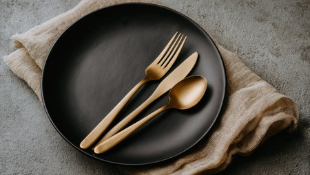 Black plate with gold-colored cutlery, positioned on a light beige linen cloth, set against a gray concrete surface. The cutlery is arranged neatly on the plate, consisting of a fork, knife, and spoon.