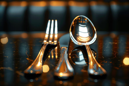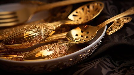 A detailed shot of a luxurious gold spoon and fork set against a dark, elegant backdrop.