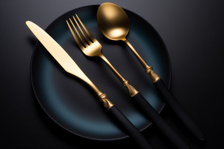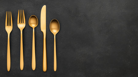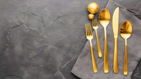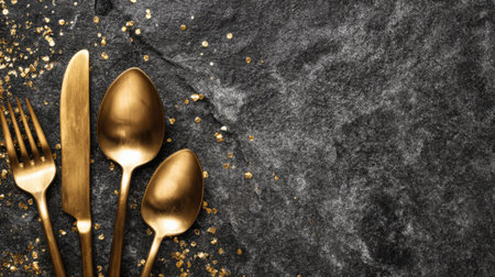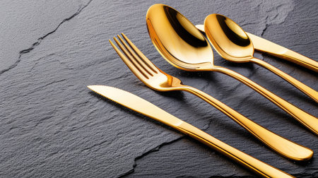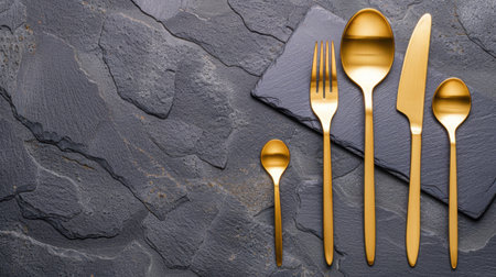 Capture the essence of modern dining with this elegant golden cutlery set placed on a textured dark stone surface, ideal for sophisticated table settings.