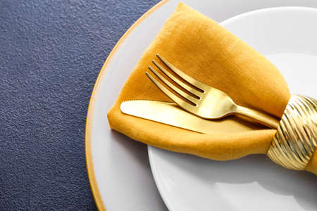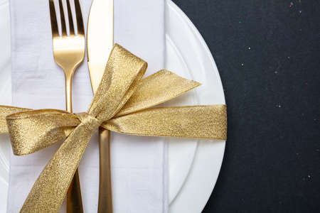 Table setting, luxury, festive. Gold cutlery on white set of dishes, black background, top view
