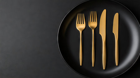 Top view of stylish gold cutlery set, including knives and forks, placed next to a black plate on a dark background. The scene exudes modern elegance.
