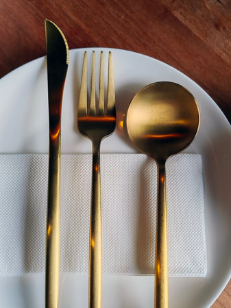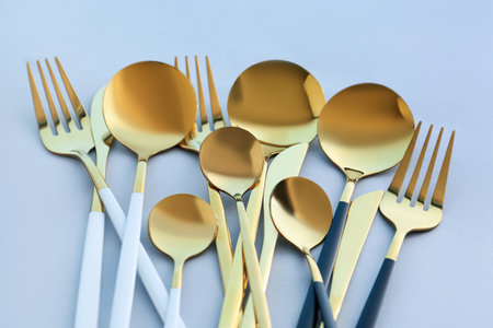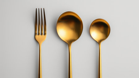 Golden spoon and fork displayed on a pristine white background. An elegant composition highlighting the luxury and refinement of premium dining utensils.