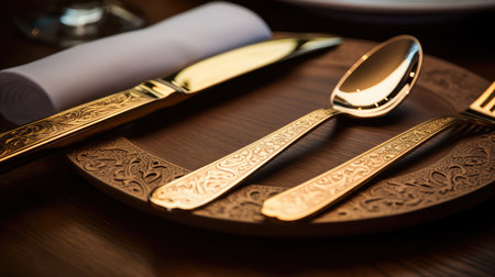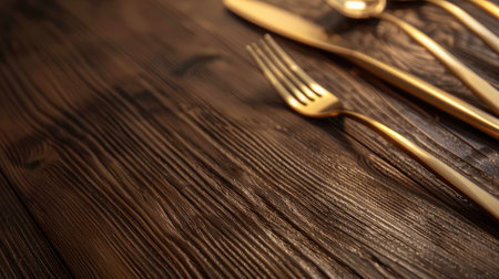 golden cutlery on a modern oak wood table, captured with a macro zoom lens to magnify the intricate textures and reflections