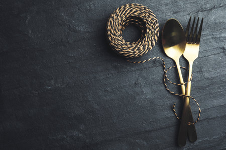 Elegant golden cutlery on a black stone table, festive Christmas and New Year table setting. Luxurious design with copy space for menu or greeting card.