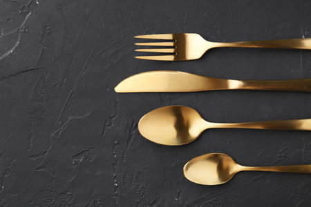 Clean golden metal cutlery on a dark background. design concept. top view.
