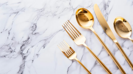 This stunning image features an elegant arrangement of gold cutlery on a marble surface, ideal for showcasing dining settings, events, or culinary art.