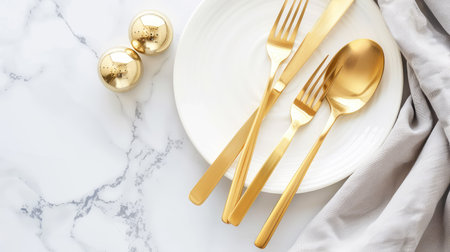 This elegant table setting features a gold cutlery arrangement paired with a pristine white plate, all displayed on a luxurious marble background. Perfect for refined dining experiences.