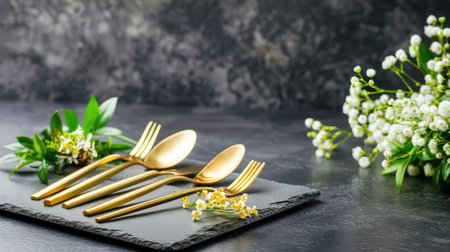 This stunning image features beautifully arranged gold cutlery on a slate background, accented by fresh flowers and greenery, perfect for elegant dining settings.