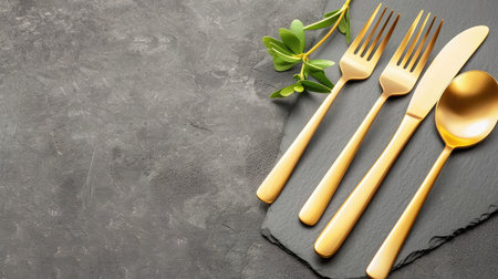 This image features a stylish arrangement of gold cutlery including a fork, knife, spoon, and a touch of greenery on a slate background. Perfect for dining themes.