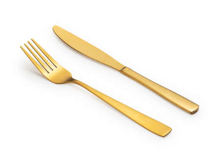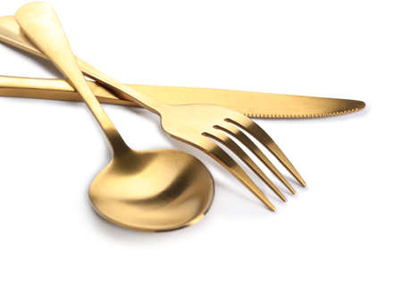 Gold knives and forks placed against a white background. Beautiful gold cutlery.