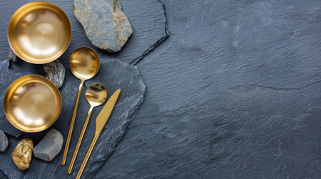 This image showcases elegant gold tableware, including bowls and cutlery, artfully arranged with natural stones against a dark slate background, perfect for modern dining.