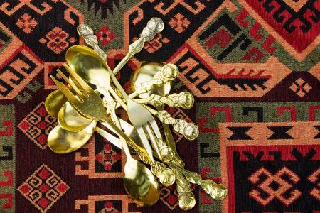 An overhead view displays a formal table setting. The composition features ornate plates, forks, knives, and spoons arranged on a textured surface. The image presents a vintage aesthetic with warm lighting, suggesting an indoor environment. This image is suitable for culinary, dining, or design-related projects.