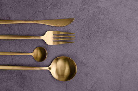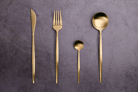 Set of gold cutlery on gray textured background