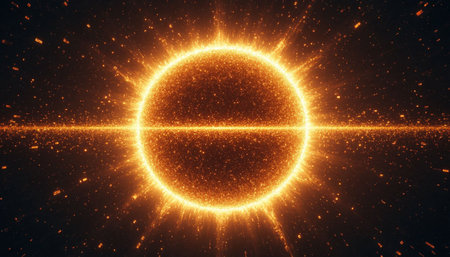 A circular sun flare emitting intense light beams and rainbow-like refractions on a black surface.