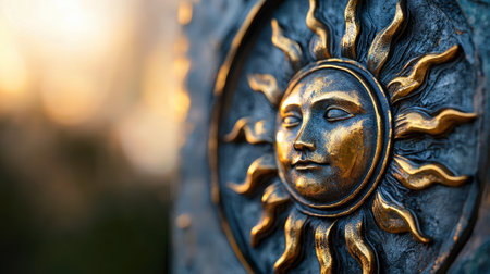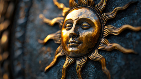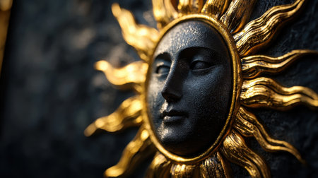 A golden sun with a face on it. The face is looking away and the sun is shining on it