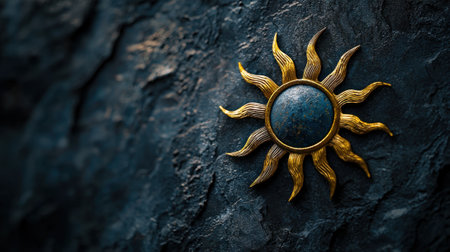 A shiny gold and blue sun is sitting on a rock. The sun is surrounded by gold and blue, creating a beautiful and eye-catching design. The rock is a dark blue color