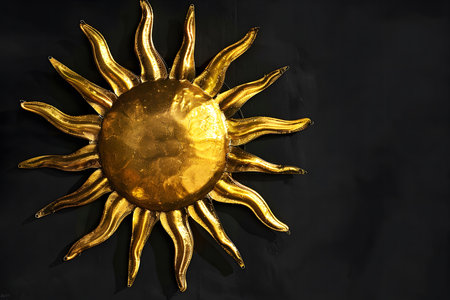 A close up of a golden sun sculpture against a black background.