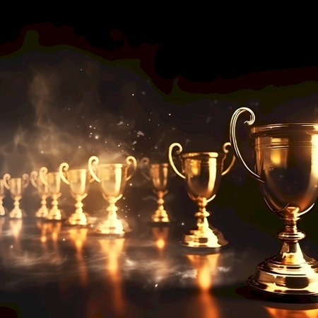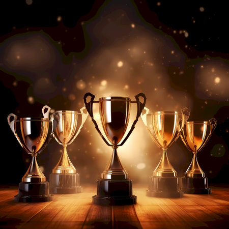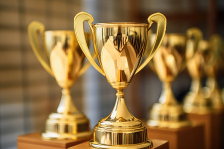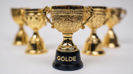 A close-up shot of a gleaming golden trophy cup, symbolizing achievement and victory, with a blurred background of similar awards.