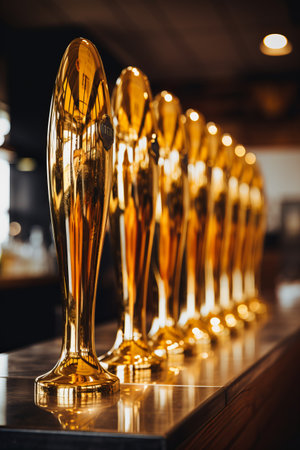A row of gleaming golden trophies, with one in sharp focus, symbolizing achievement and success.