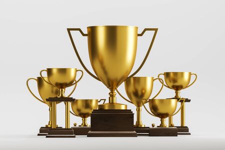 Gold champion trophies on dark wooden stands standing on white surface over white background. Concept of leadership in business and sport. 3d rendering