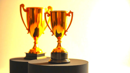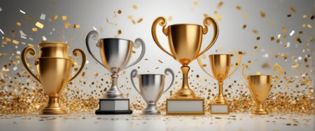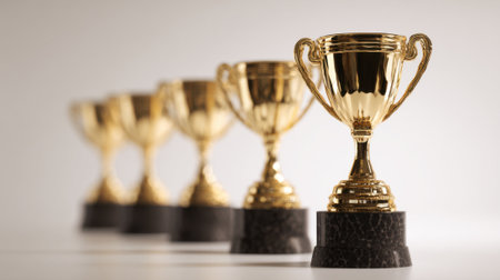 A captivating arrangement of shining gold trophies set against a bright background, representing achievement and success in competitions and celebrations of excellence.