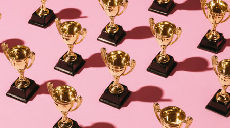 A top-down shot showcases numerous golden trophies meticulously arranged diagonally across a soft pink surface, symbolizing achievement and recognition.
