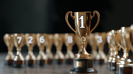 A golden number one trophy standing in front of a row of smaller numbered trophies, symbolizing top rankings