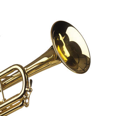 Close up of trumpet on white background. Detail of old trumpet instrument.