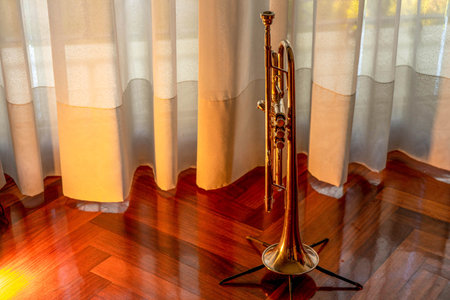 Gold trumpet standing on the dark floor on the blurred background in the night club