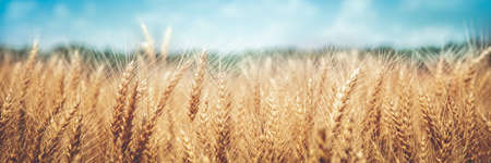 Close-up image of wheat stalks in a field, emphasizing the golden hues and details of the heads of grain. The sky is a pale light blue, suggesting a sunny day.