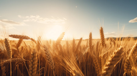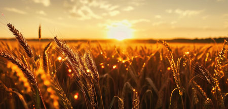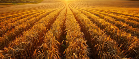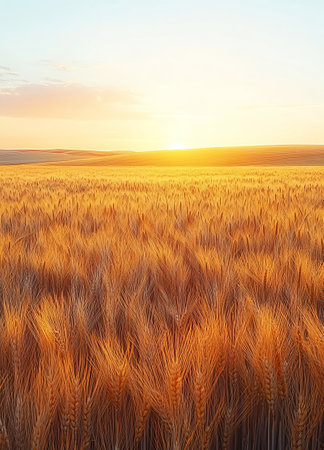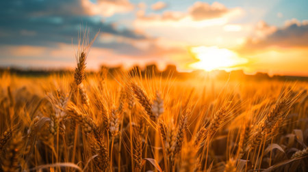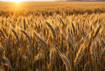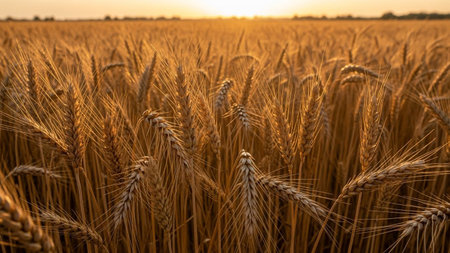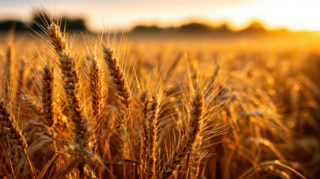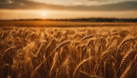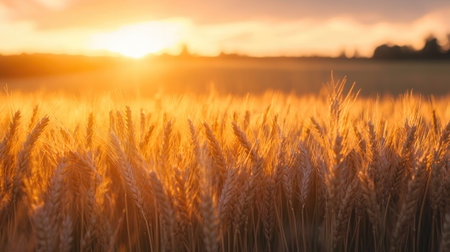Vibrant golden wheat stalks stand tall in a sprawling field as the sun sets, casting a warm glow over the landscape. The scene captures the beauty of a harvest-ready crop.