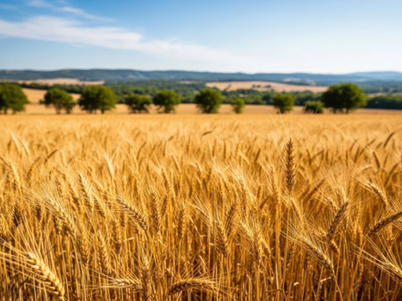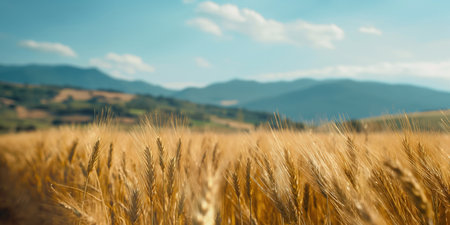 Golden stalks of wheat stand tall, gently swaying in the warm afternoon sunlight. The vast countryside stretches behind, highlighting nature's serene beauty and abundance.