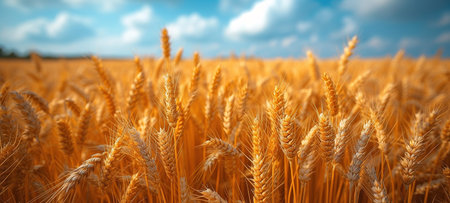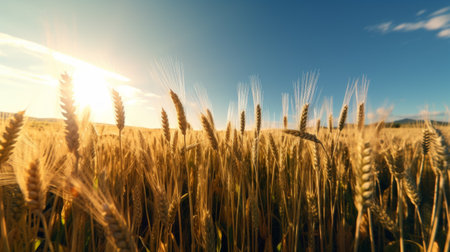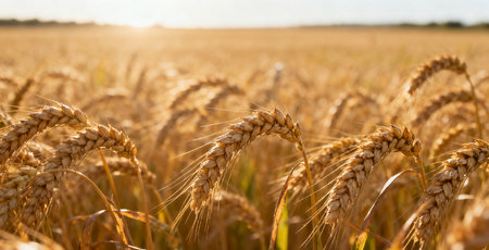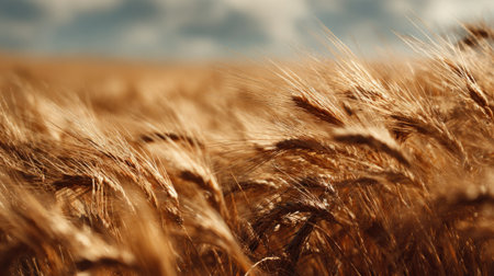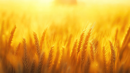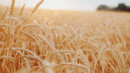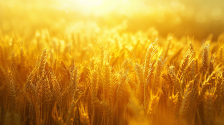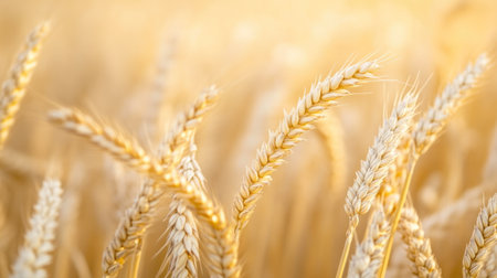 A detailed close-up shot of a golden wheat field bathed in bright sunlight. The focus is on the individual stalks and ears of wheat, showcasing their texture and rich amber color. The background is a blur of more wheat, creating a sense of depth and abundance. evokes feelings of warmth, harvest, and the natural beauty of agricultural landscapes. It highlights the essential qualities of this vital food source.