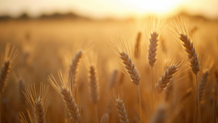 A close-up view of a golden wheat field bathed in the warm, radiant light of a sunset. The detailed stalks of wheat, heavy with grain, fill the frame, showcasing their intricate textures and the rich, golden hue. The low angle of the sun casts long shadows and highlights the individual ears of wheat, creating a sense of depth and abundance. The soft, diffused sunlight and the vast expanse of the field evoke feelings of peace, serenity, and the beauty of nature's bounty. captures the essence...
