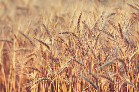 Golden ears of wheat in the field at sunset. Shallow depth of field