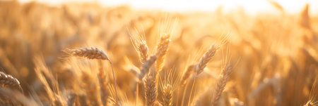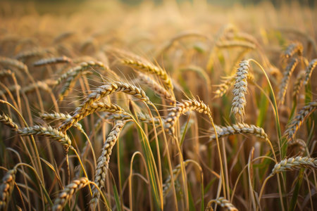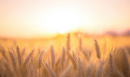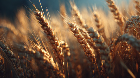 Captivating close-up of golden wheat stalks bathed in soft morning light, showcasing the beauty of nature and the bounty of agricultural fields.