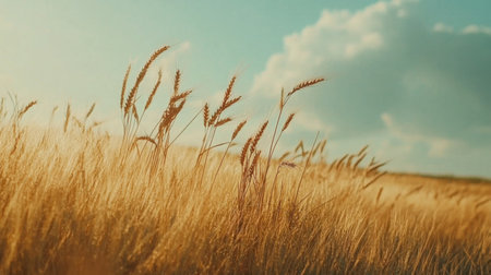 Golden stalks of wheat dance softly in the warm breeze under a setting sun. The tranquil countryside creates a peaceful atmosphere, highlighting the beauty of nature's harvest.