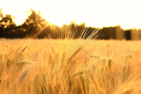 Sunset or sunrise in a wheat field with ears of golden wheat.
