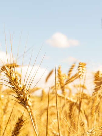 Ripe ears of wheat. Wheat field. Blue sky with clouds. Summer harvest of ripe wheat. Golden ears. Agriculture. wheat is ripe. golden wheat field and sunny day