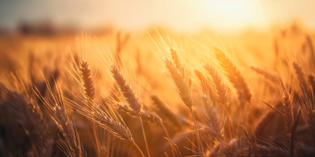 Close-up of golden wheat ears moving softly in the wind, backlit by the warm glow of the setting sun