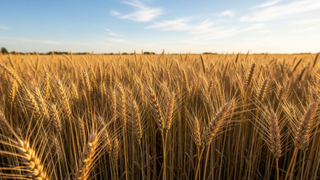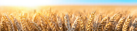 A close-up view of a vast golden wheat field under a clear blue sky. The sun's warm light illuminates the ripe wheat stalks, creating a rich, golden hue. The field stretches towards a distant horizon, suggesting abundance and the bounty of nature. The evokes a sense of peace, serenity, and the beauty of agricultural landscapes.