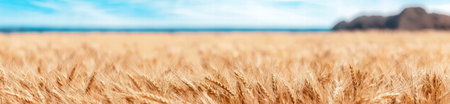 Close-up of ears of golden wheat of wheat field, serene scenery. Nature landscape background of ripening ears of wheat field. Rural rich harvest concept. Gen ai illustration. Copy ad text space