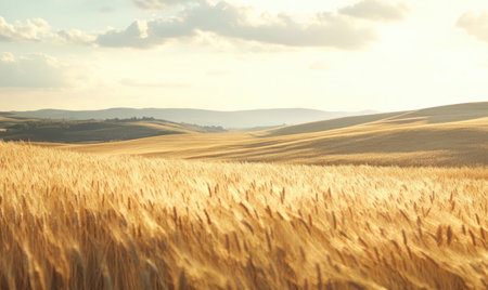Golden stalks of wheat dance softly in the warm breeze under a setting sun. The tranquil countryside creates a peaceful atmosphere, highlighting the beauty of nature's harvest.