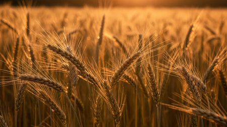 A close-up view of a golden wheat field bathed in the warm, radiant light of a sunset. The detailed stalks of wheat, heavy with grain, fill the frame, showcasing their intricate textures and the rich, golden hue. The low angle of the sun casts long shadows and highlights the individual ears of wheat, creating a sense of depth and abundance. The soft, diffused sunlight and the vast expanse of the field evoke feelings of peace, serenity, and the beauty of nature's bounty. captures the essence...